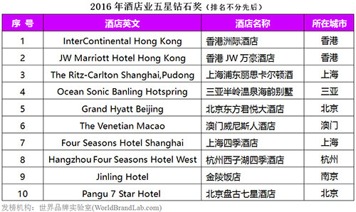 “五星钻石奖”是国际公认最具权威的超级品牌奖,旨在奖励在金融业、酒店业、航空业和餐饮业等服务领域有突出贡献的“五星级品牌”企业。这是世界品牌实验室自2006年以来第十一次对中高端服务业的品牌影响力进行的测评。除了香奈儿、香港洲际酒店、金陵饭店等老品牌入选外,理念新颖的时尚品牌如BreadTalk面包新语、星巴克等品牌连续入榜。另外,注重客户体验并以优质服务见长的首都航空、青岛银行首次入选今年的五星钻石奖。